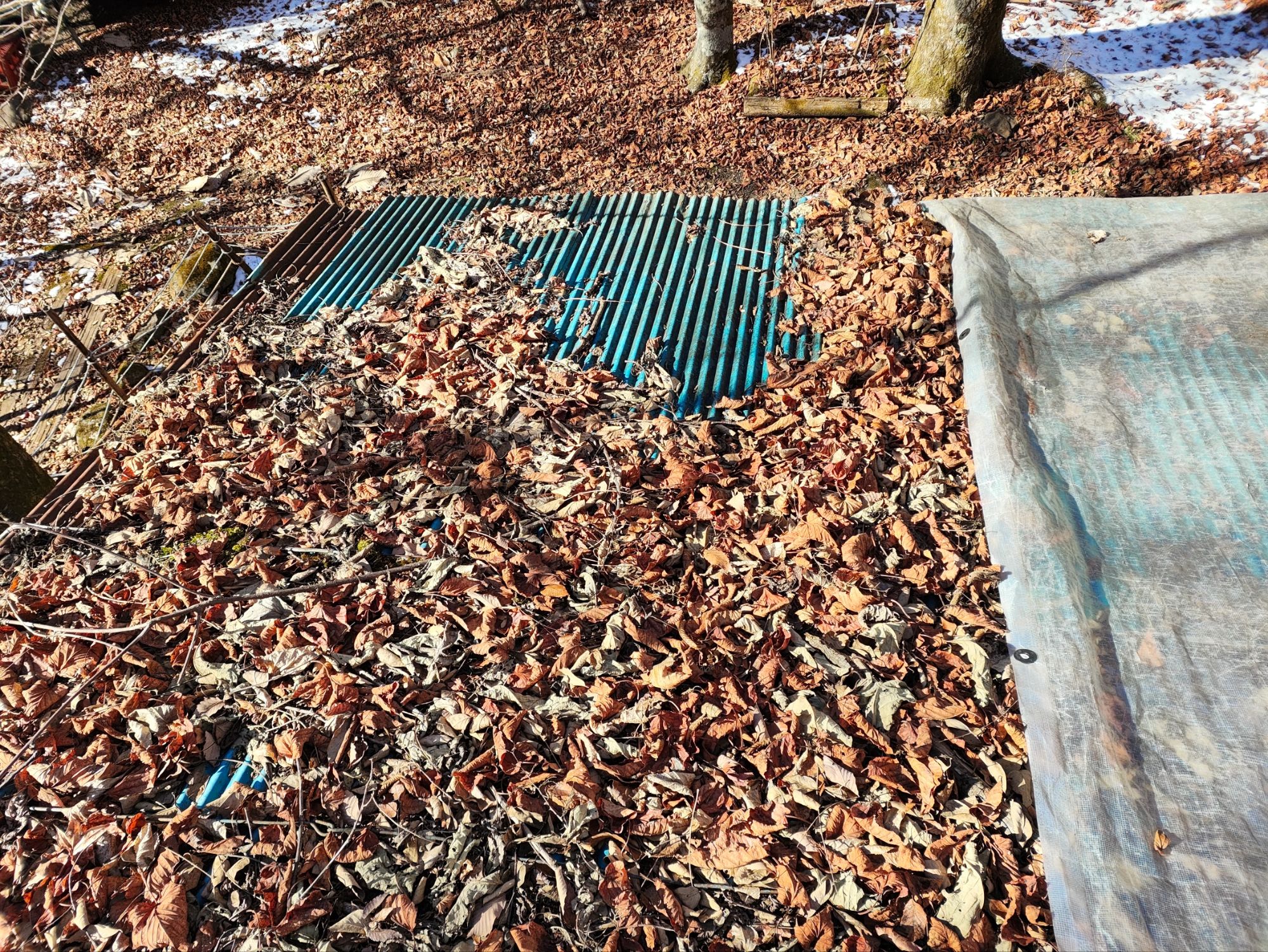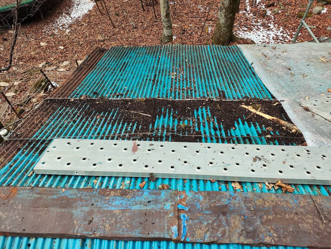 徹底的に落ち葉や、腐葉土を取り除いたら、屋根を剥がしますが、2重になっているのでなかなか簡単に剥がせません。