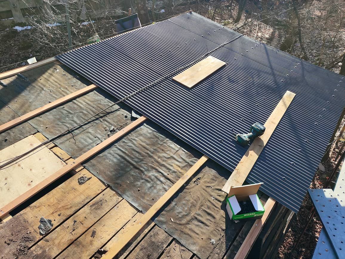 下地作りが終わり、ナミイタを平らに張っていくための桟木を付けたら、ガルバリウム鋼板製ナミイタ板を張って行きます。